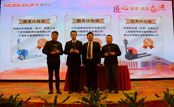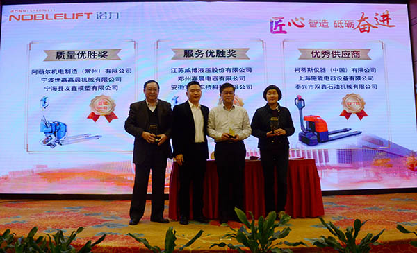 大会上,诺力步驾式车辆科技部部长罗曼进行了重点制品推荐,总经理助理、四期工厂厂长陈黎升介绍了四期智能工厂建设情况,品质经营部部长周伟宝就购置件品质劳务工作提出要求。江苏威博液压股份有限公司等2家优秀供货商代表在会上作了典型发言,上海士商进出口有限公司等2家供货商在大会上签订年度购置协议,柯蒂斯仪器(中国)等9家优秀供货商受到隆重表彰。